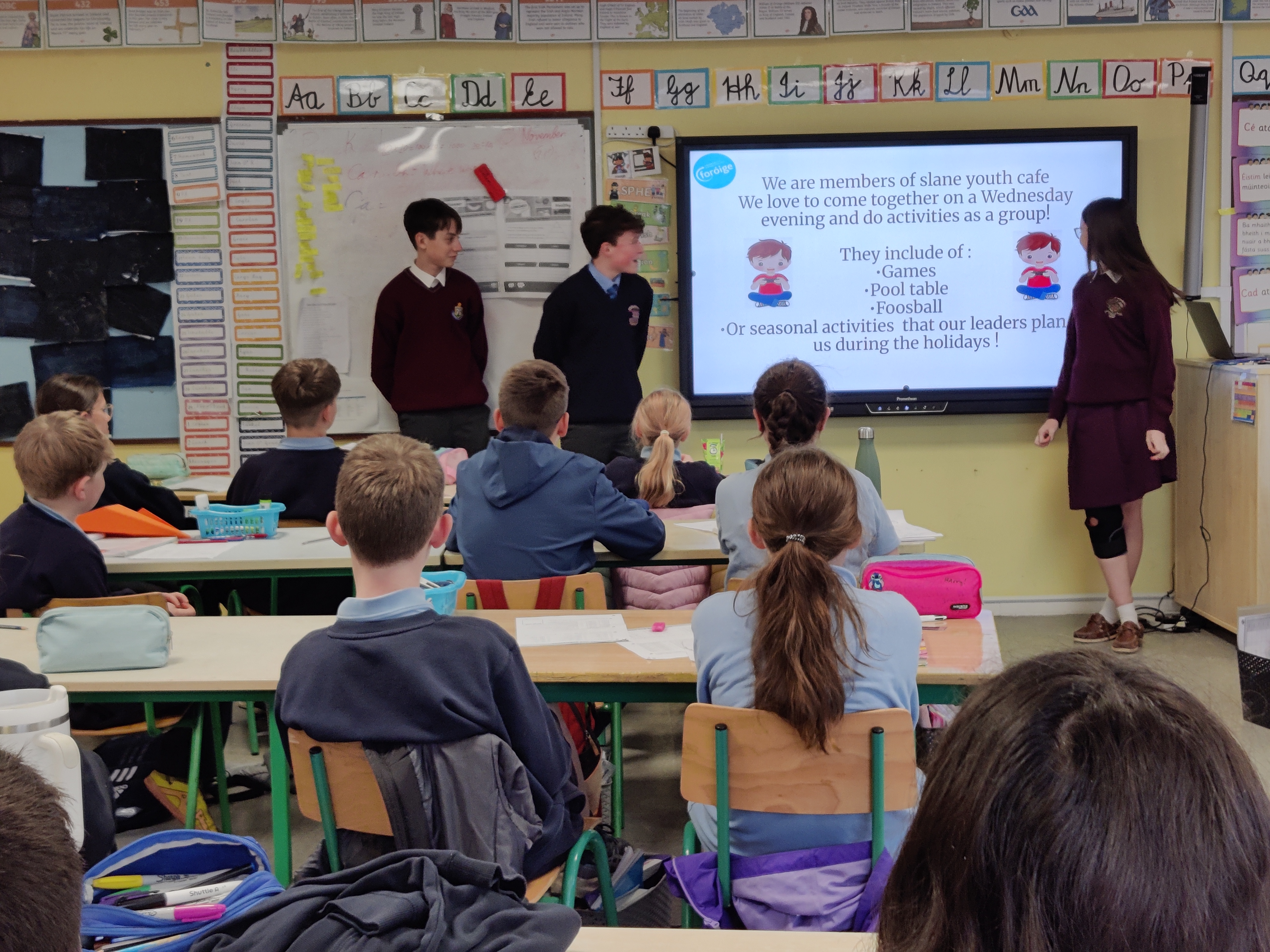 They called to 5th and 6th class to discuss an upcoming open day for 6th class pupils to try out the Youth Café on Wednesday the 26th of November from 7-8pm.
